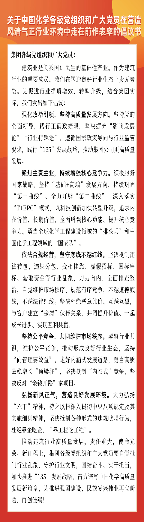 - ☆ 关于中国化学各级党组织和广大党员在营造风清气正行业环境中走在前作表率的倡议书 2025-09-03